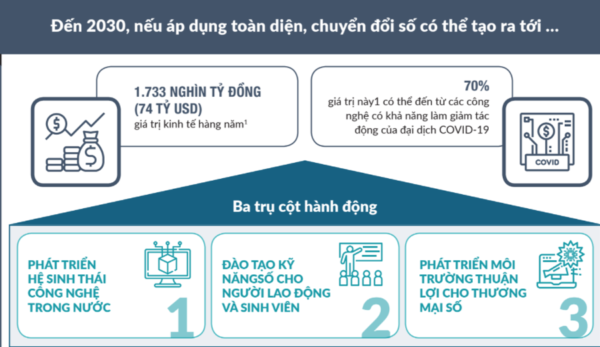“Bằng cách hỗ trợ doanh nghiệp kết nối với khách hàng thông qua công nghệ số và giảm thiểu tắc nghẽn hậu cần (logistics) do gián đoạn chuỗi cung ứng, công nghệ có thể giúp doanh nghiệp kiểm soát các tác động nghiêm trọng của Covid-19. Ước tính khoảng 70% tổng cơ hội kỹ thuật số của Việt Nam (tương đương giá trị 1,216 triệu tỷ đồng khoảng 52 tỷ USD) có thể xuất phát từ những ứng dụng công nghệ như vậy”, báo cáo nhấn mạnh.