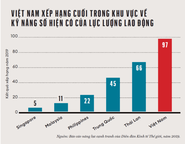 Đáng tiếc là Việt Nam đang tụt hậu xa so với các đối thủ cạnh tranh chính trong khu vực về các kỹ năng số hiện có (xem Hình). Nếu chúng ta giả định rằng Việt Nam sẽ tụt hậu do không đáp ứng được yêu cầu về số lượng lao động có tay nghề cao trong quá trình chuyển đổi số nhanh chóng, nền kinh tế có thể mất tới 2 triệu việc làm vào năm 2045. Nói một cách thẳng thắn là theo giả thiết này, chuyển đổi số có khả năng dẫn đến việc công nghệ thay thế con người, làm giảm lợi ích chung của nền kinh tế và tạo ra sự bất bình đẳng lớn, từ đó có thể làm phát sinh nhiều hệ lụy về kinh tế và xã hội.
